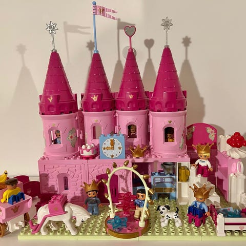 Lego Dublo Prinsessalinna vuodelta 2008. Ollut yhden lapsen käytössä. Setistä puuttuu: toinen prinsessa, aarrearkku, hiusharja, 2 x makuupussi ja hame. Osa tarrojen kiinnityksistä irronnut reunoistaan. Lipputangon varsi vähän vääntynyt ( toimii).
