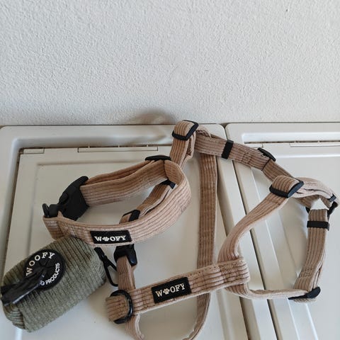 Woofyn pienen koiran kaulapanta ja valjaat. Molempien väri sky blue. Kaulapannan koko XS ja sitä käytetty noin kaksi kuukautta. Valjaat kokoa S ja käytetty kaksi kertaa. Kaulapanta 6€ ja valjaat 18€. Molemmat pakettina yhteensä 20€.