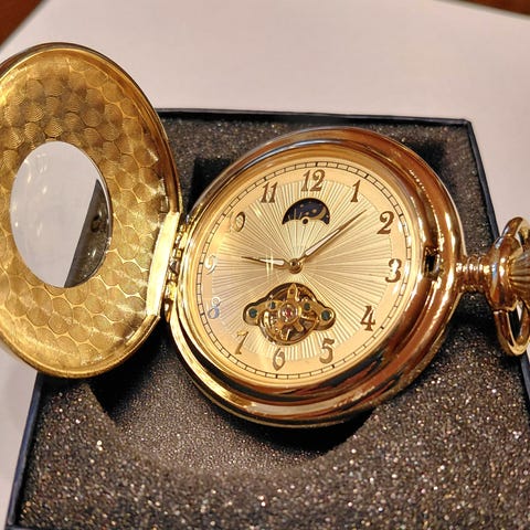 Uusi taskukello, 52mm, koneisto näkyy takakannesta, paristolla, ketjut mukaan