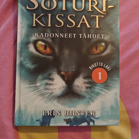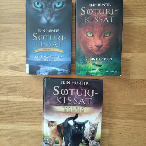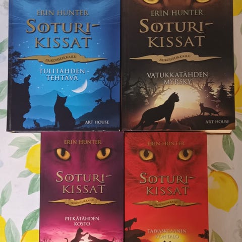 Kuvassa näkyvät kirjat ovat Erin Hunterin kirjoittamaa suosittua Soturikissat-fantasiakirjasarjaa.
