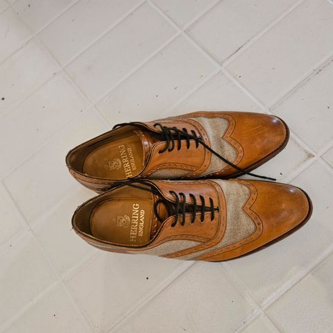 Käytetyt, mutta ehjät ja hyvässä kunnossa, myös pohjat. Kengät on puolipohjattu, joten puolipohjat on helppo vaihtaa tarvittaessa, goodyear welted -rakenne mahdollistaa myös koko pohjien vaihtamisen taitavalla suutarilla. Kengät tehty siis pohjien ompelu -rakenteella, ei liimaamalla ja nämä kengät ovat Herring -sarjaa joka on tehty käsin Englannissa, Northamptonissa - eivät ole Aasian tuotantoa, kuten jotkin uudemmat Herringin tuotantosarjat. Tässä siis käsin Englannissa tehdyt, käytetyt kengät edullisesti tarjolla.