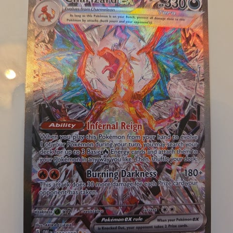 Pokémon Charizard keräilykortti, jolla on 200 HP ja Crimson Dive -hyökkäys. Kortti sisältää holografisen kuvan Charizardista ja on osa Pokémon-korttipeliä.