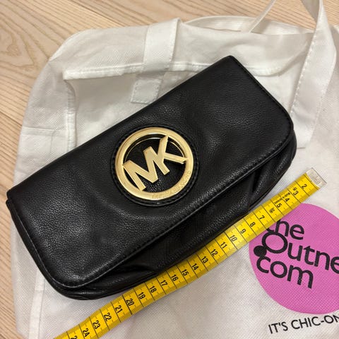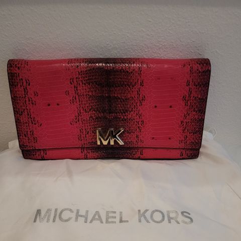 Michael Kors nahkainen iltalaukku / kukkaro. Lompakossa on vetoketjullinen päällinen ja ranneke. Lohenpunainen laukku kultaisin yksityiskohdin. Koko noin 10x20cm. Saatu tuliaisina jenkeistä ~2013, ei koskaan käytetty.