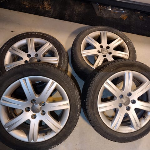 Alkuperäiset Audin vanteet huononastaisilla nastarenkailla. Renkaissa on kuitenkin pintaa vielä jäljellä noin 5mm verran. Vanteissa on käytön jälkeä ja pesun tarvetta. Ajossa ei ole ollut havaittavaa epätasaisuutta, joten oletus on, että vanteet ovat suorat. Kaupanpäälle Audin alkuperäinen vararengas (kesärengas) samanlaisella vanteella.