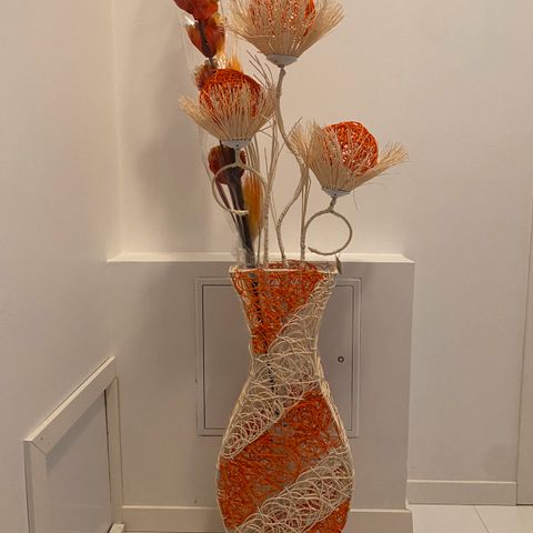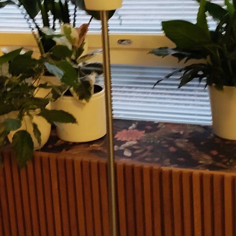Jalkalamppu, jalusta (halk. n. 33 cm) ja jalka (korkeus n. 150 cm) metallia (kromia?), kupu valkoista lasia (halk. n. 40-45 cm, korkeus n. 20 cm). Hinta 50 euroa. Vain nouto Arabianrannasta.