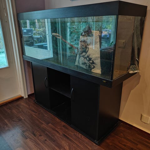 Akvaario on noin 10 vuotta vanha. Käytön jälkiä löytyy, mutta kokonaisuudessaan siisti. Laseissa on joitakin naarmuja, pääasiassa hiekan rajalla alhaalla; eivät juuri näy akvaarion ollessa käytössä (vedet ja hiekat paikallaan).