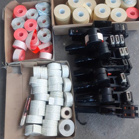 Jonkin verran valkoisia hintalappuja jäljellä, mutta ehkä muste vähissä? Mekaanisesti tuntuisi toimivan, mutta ei takuuta kun ei voi kunnolla testata. Näyttäisi että tähän saa vielä tarvikkeita, esim. hintalappuja: