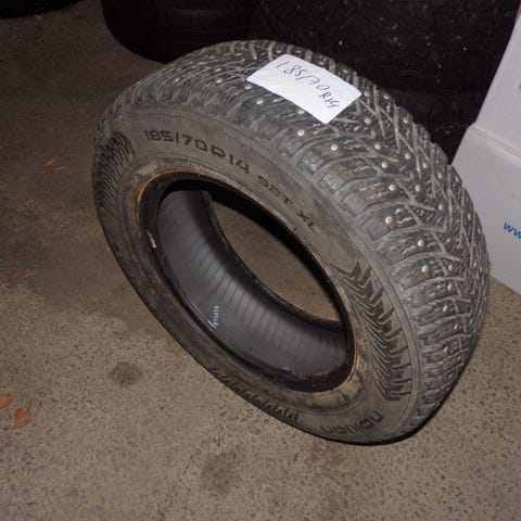 Yksittäinen ajamaton nastarengas. Uusi, mutta varmaan riittävän vanha ostamaan kaljaa kaupasta. Unohtunut rengasvaraston perälle aikanaan.