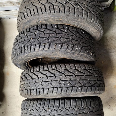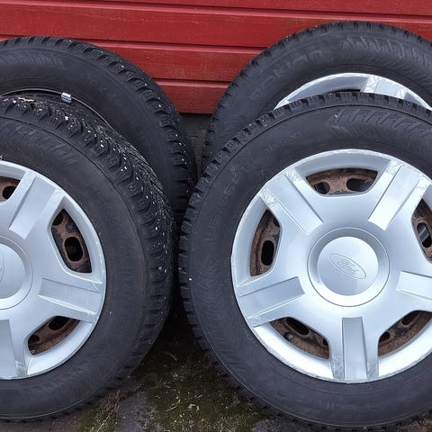 Nastarengassarja Ford Fiestan peltivanteilla, 2kpl Continentalin ContiIceContact renkaita ja 2kpl Gislaved NordFrost 100 renkaita, pintaa kaikissa n.7mm ja yksittäisiä nastoja puuttuu. Koko 175/65R14