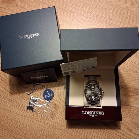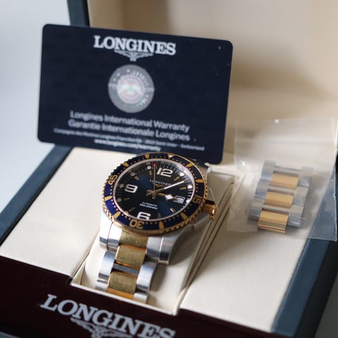 Longines Hydroconquest miesten rannekello, jossa musta kellotaulu ja kulta-teräsranneke. Kellossa on pyöreä kuori ja päivämääränäyttö. Rannekkeen materiaali on ruostumaton teräs, jossa on kullanvärisiä yksityiskohtia.