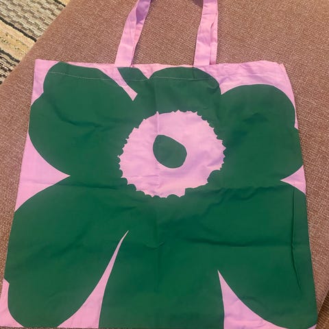 Marimekko kangaskassi, valmistettu 100 % kierrätetystä puuvillasta. Materiaali on muu materiaali, ja tuote on suunnattu naisille. Kassi on kuvioitu Marimekon tunnusomaisella kukkakuosilla.