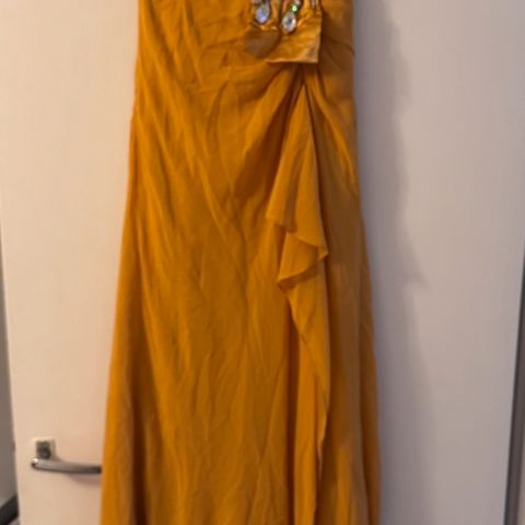 Kerran käytössä ollut. Selässä nyöritys ja helma ommeltu kerroksittain. Olkaimeton.