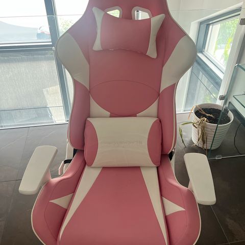 Vaaleanpunainen-valkoinen väreillä oleva blackstormin pelituoli. Pelituoli ollut käytössä pari vuotta, toiminut upeasti eikä nytkään mitään vikaa. Itsellä ei enää käyttöä ollut hetkeen, joten nyt tuoli etsii uutta kotia. Kissan raapimajälkiä hiukan selkänojassa ja tuolin päällä (kissa tykännyt istuskella nojan päällä).