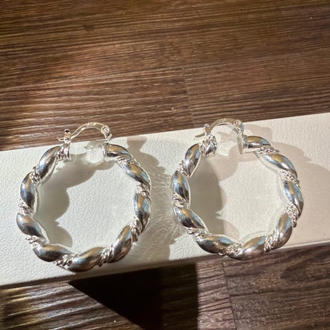 Hopeiset korvakorut ovat ihan kirkkaan hopean väriset, kuvassa kellestävyyttä valosta