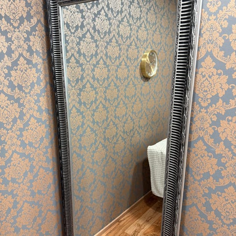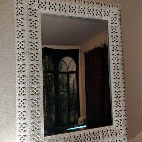 Peili, jossa on koristeellinen kehys, jossa on kuusikulmaisia ja monikulmaisia kohokuvioita. Kehyksen väri on metallinen pronssin sävy. Peilin koko ja materiaali eivät ole tiedossa.