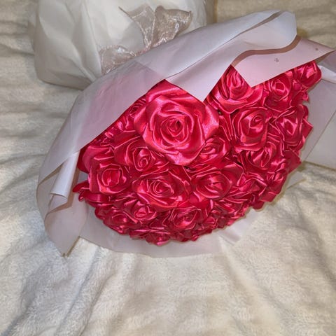 Itse tehty sydämenmuotoinen lahjakimppu. Ferrero-konvehteja ja satiininauhasta itse tehtyjä ruusuja