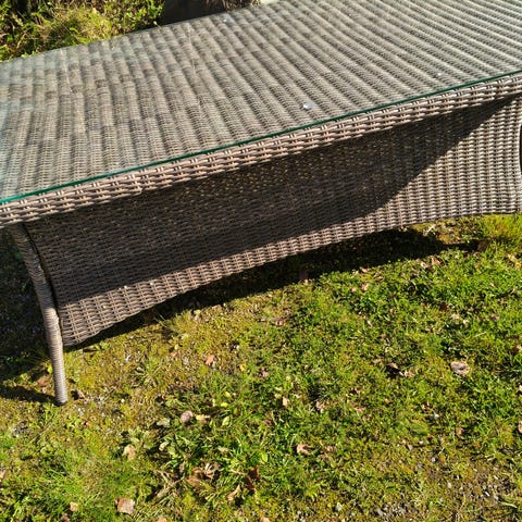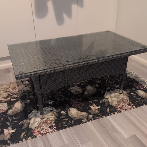 Lasipöytä, jossa on lasikansi ja punottu pohja.