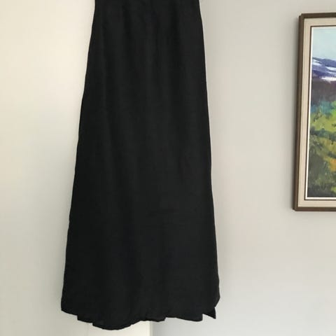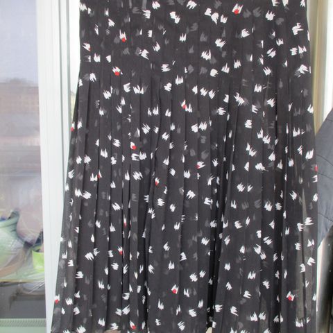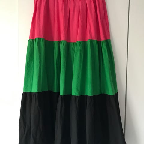Moitteettomassa kunnossa oleva pitkä hame 70-luvulta, Nana Suni design. Kaunis, punaisen sävyissä oleva, kuosiin kudottu tuleva kangas, joka muistuttaa puuvillaa, vaikka onkin akryylia. Vinoon leikattu. Vuorillinen, vetoketju sivulla. Hameeseen kuuluu leveähkö kangasvyö, joka on kevyesti kiinni sivuilta ja solmitaan eteen. Vyön saa halutessaan helposti pois.
