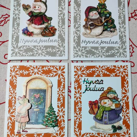 Neljä tuikkukynttiläkorttia, ei kirjekuoria. Korttiosa avattava, tekstitön sisäpuoli. Tuikut 4h paloaika, metallikuorella ja tuoksuttomia.