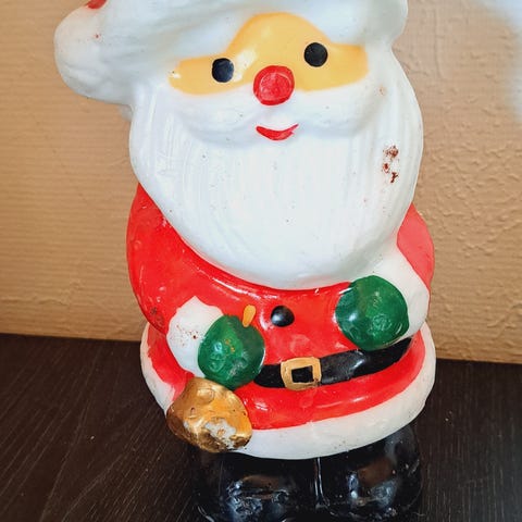 Kolme vanhaa, viirusilmäistä joulupukkia, isoin korkeus 15cm, leveys 8cm, paksuus 7,5cm. Keskimmäinen korkeus 8cm, leveys 4,5cm, paksuus 4,5cm. Pienin korkeus 3,5cm, leveys 3cm, paksuus 2cm. Pientä kulumaa pinnoissa. Yhteensä 10€.