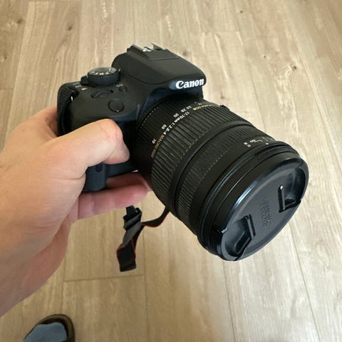Canon EOS 100D digitaalikamera, mukana objektiivi EF-S18-55mm f/3.5-5.6 IS STM. Pakettiin kuuluu myös kameran laukku, muistikortteja ja suoja, ohjekirjat ja tarvittavat kaapelit. Kamera on suunniteltu valokuvaukseen ja videokuvaukseen.