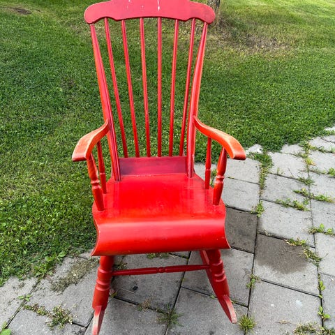 Keinutuoli on tukeva ja hyväkuntoinen. Istuimen päällä muutama raapu ja vähän kulumaa käsinojien päässä.