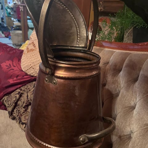 100v vanhat kuparisangot ovat olleet kovassa käytössä ja niissä on jälkiä, kuhmuja, klommoja ja patinaa. Suurin sanko on hiukan kallellaan. Pienimmän sangon nokan reunaa on paikkailtu ja korjailtu. Sisällä kaikissa on tummentumaa. Kuluneina ja käytettyinä näissä on juurikin oma viehätyksensä.