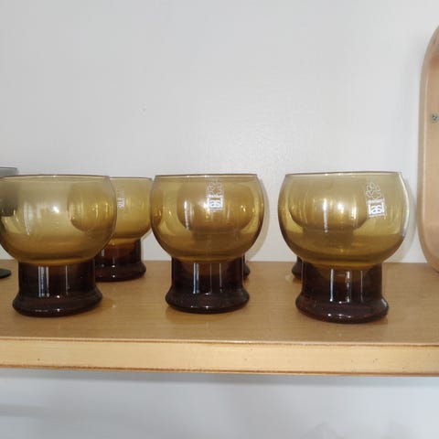 Kauniit vanhat boolilasit, joiden värissä on amberin ja ruskean sävyjä. Ehjät ja hyväkuntoiset, yhdessä tarra.