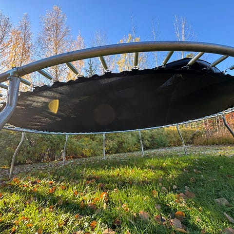Annetaan trampoliini, valmiiksi purettuna. Puoli vuotta sitten annetaan-osastolta hankittu. Verkko hieman rikki, kuvassa osittain jo irroitettu.