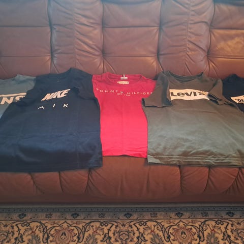 Sekalainen kokoelma kotoisan pehmeitä T-paitoja. Koot vaihtelevat välillä 152-164cm. Osassa paidoista painatukset jo vähän kärsineet.