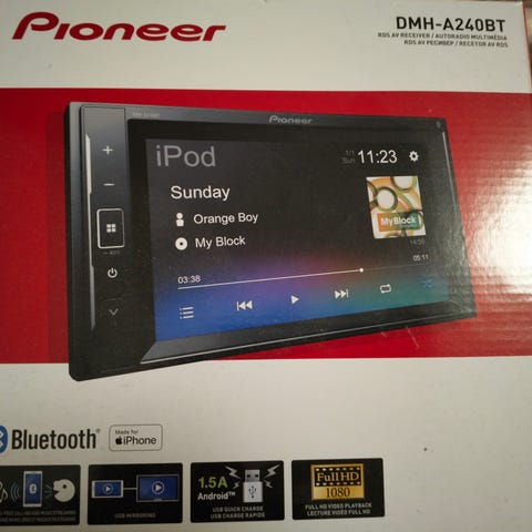 Pioneer DMH-A240BT on Autosoitin, jossa on Bluetooth-yhteys. Laitteessa on kosketusnäyttö ja se tukee iPod-laitteita. Mukana tulee alkuperäinen pakkaus ja kaikki alkuperäinen. Alle vuoden vanha kuitti löytyy.