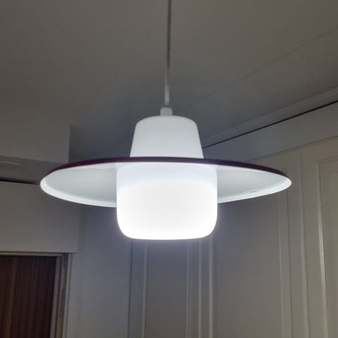 Vanha kattolamppu. Akryylimuovia. Vaalean ruskea/valkoinen. Täysin ehjä, ei halkeamia. Halkaisija noin 45cm. Sähköt kunnostettu, puutteet korjattu. E27 kanta. Pistotulppa asennettu. Johdon pituus reilu metri. Tämä sopii erinomaisesti esim keittiönpöydän päälle. Selkeälinjainen trumpettimainen muotoilu. Valaisee hyvin.