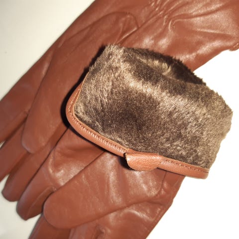 Naisten nahkahanskat. Koko 8. Pieni saumapako toisen hanskan reunassa, helppo korjata.