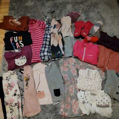 Vaatepaketti 110/116/122 ja osassa pieni 128 (esim H&M). Eniten 110 ja 116 kokoa vastaava. Suurin osa tullut meille uutena. Kaikki vaatteet menee hyvin vielä seuraavalle. Ovat ehjät, mitään isompia tahroja en huomannut, jotain pientä toki saattaa löytyä jostain.