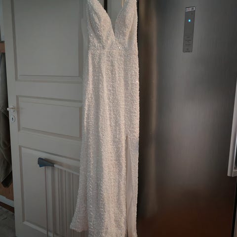 Punainen paljettinen ilta- tai juhlapuku, naisten M-koko. Puku on koristeltu paljeteilla ja sopii juhla- ja iltatilaisuuksiin.