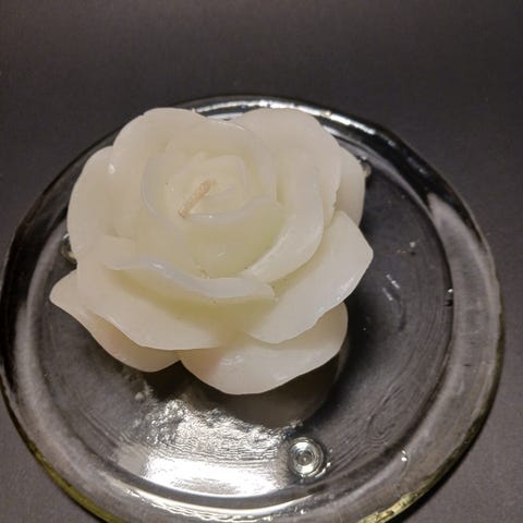 Vintage, käsityönä valmistetut lasiset alustat ja valkoinen ruusu kynttilä