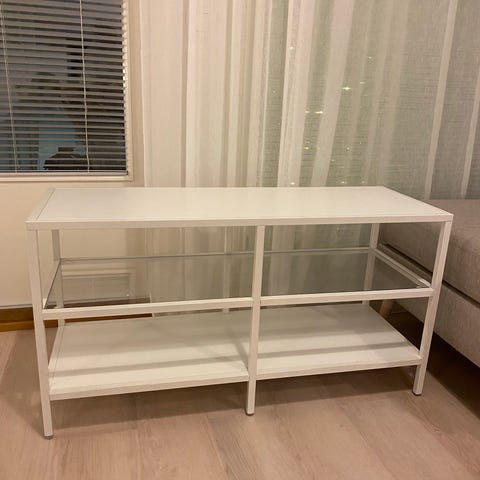 Myydään Ikean Vittsjö-hylly/tv-taso. Pientä käytönjälkeä voi olla, mitään isompaa en huomaa, naarmuja tms. Vain nouto Haagasta.