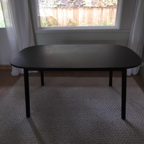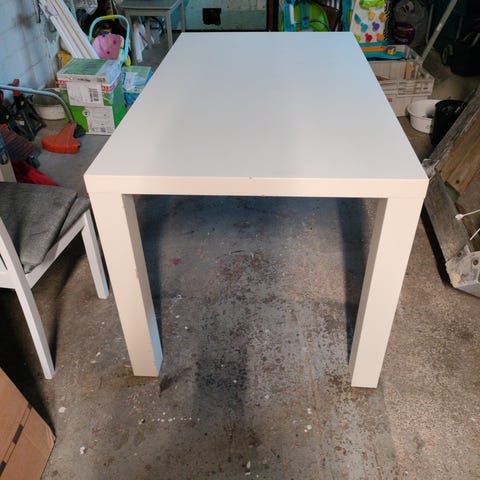 Jyskin valkoinen ruokapöytä, siistissä kunnossa. Yhdessä kulmassa ainostaan pieni moite mistä maali lähtenyt.