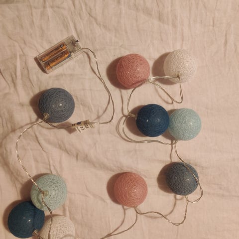 Harmaa-valkoiset pallovalot. Toimivat, yksi pallo irti (helposti korjattavissa).