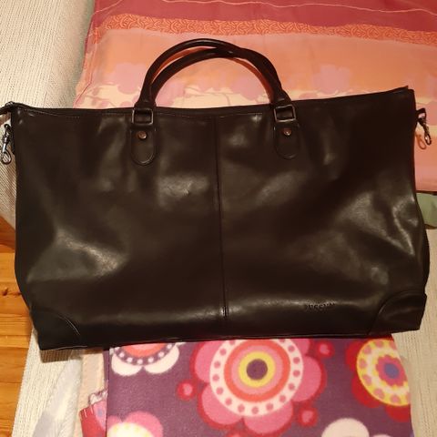Kotimainen laukkuaseman käyttämätön olkalaukku. Musta. Napakkaa kangasta.