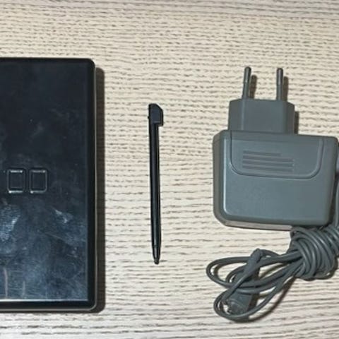 Nintendo DS Lite konsoli, virtalähde ja kynä.