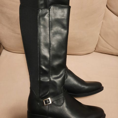 Uudenkiiltävät naarmuttomat pitkävartiset mustat keinonahkasaappaat. Korko 6 cm. Koko 37. Kapeajalkaiselle ja kapeapohkeiselle. Myynnissä Lohjalla, mutta kulkeutuvat ilman postimaksua Helsinkiin, Espoon Ikealle ja Espoon keskukseen. Myynnissä myös muualla. Hp. 20 euroa