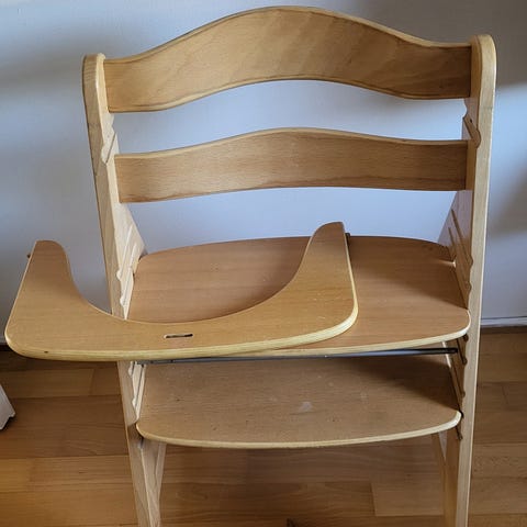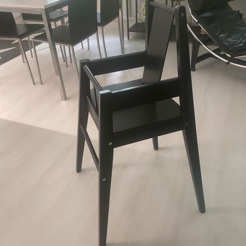 IKEAn valkoinen Antilop-merkkinen syöttötuoli. Tuolissa muovinen istuinosa ja irrotettavat metallijalat. Turvavyö puuttuu.