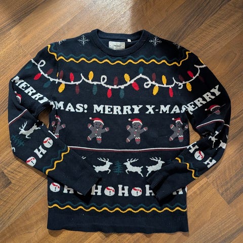 Silly Santa jouluvillapaita. Unisex-malli, jossa koko vastaa miesten kokoa S tai naisten kokoa M. Aavistus nukkaa pinnassa mutta muuten siisti ja tahraton.