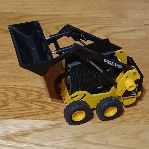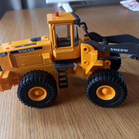 Volvo pyöräkuormaaja lasten lelu. Keltainen ja musta väri, muovimateriaali. Sopii lasten leikkeihin ja leluautokokoelmiin.