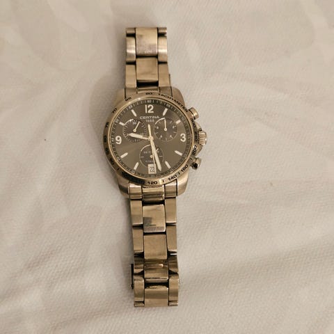 Tyylikäs miesten rannekello, kevyttä käytön jälkiä rannekkeessa ja rungossa (mikronaarmua). Safiirilasi naarmuton. Full set laatikolla, papereilla sekä jatkopaloilla. Paristo vaihdettu 08/2025. Ref. C001.417.11.057.00