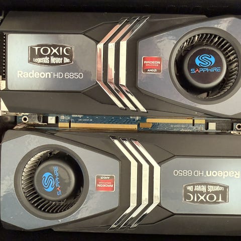 2kpl HD6850 näytönohjaimia, i7 prosessori, P67A emolevy ja 2kpl XMS3 muisteja