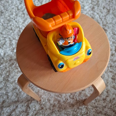 Fisher-Price Little People leikkiauto keltaisena ja oranssilla värillä, mukana punatakkinen hahmo sinisellä hatulla. Leikkiauto on muovia ja suunniteltu lasten leikkeihin.