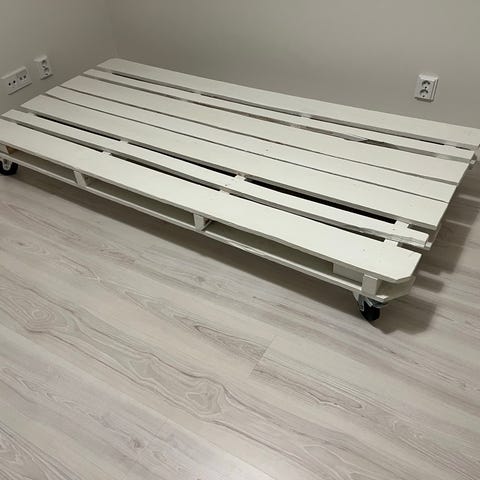 Ehjä tukeva sänky. Mukana paksu vaahtomuovipatja. Alapuolella kolme isoa laatikkoa säilytystä varten. Pientä käytönjälkeä löytyy.