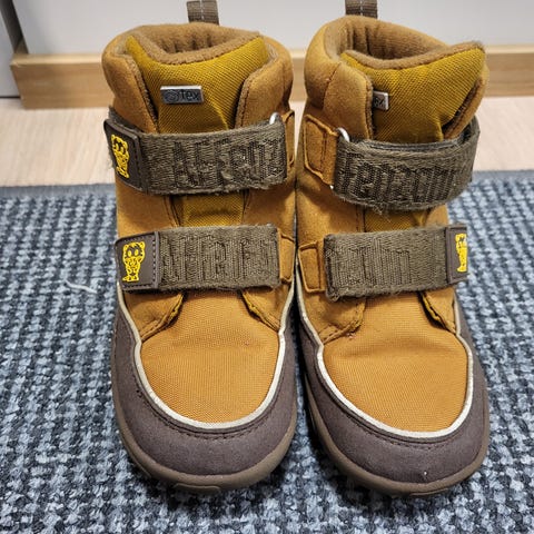 Käytetyt, mutta edelleen ihan siistikuntoiset Affenzahn talvikengät, koko 30. Kenkien sisäpuolen villa on painunut, mutta ehjä ja siisti. Ainoa moite on tuo kärjessä näkyvä heinastinnauhan kuluma, joka selkeästi nähtävissä.